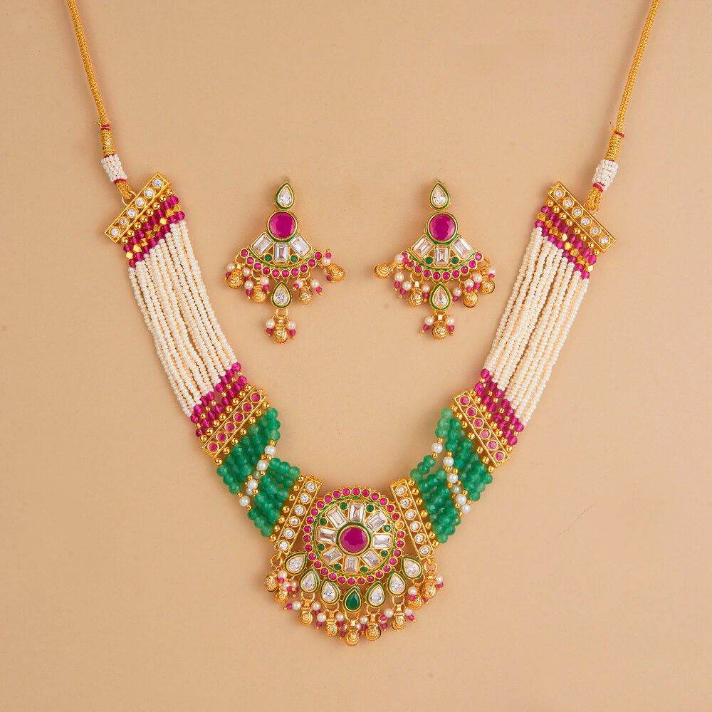 A magnificent blend of pearls, green beads, and vibrant kundan stones for a bridal look that truly shines.