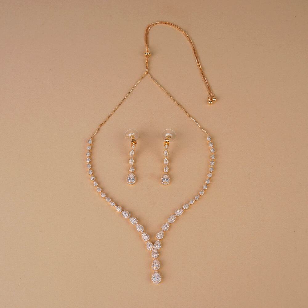 Keep things timeless with the Classic Spark Set. The necklace and earrings feature round sparkling stones lined up for a simple, elegant finish. Its lightweight charm makes it a favorite for any wedding, adding just the right touch of celebration.