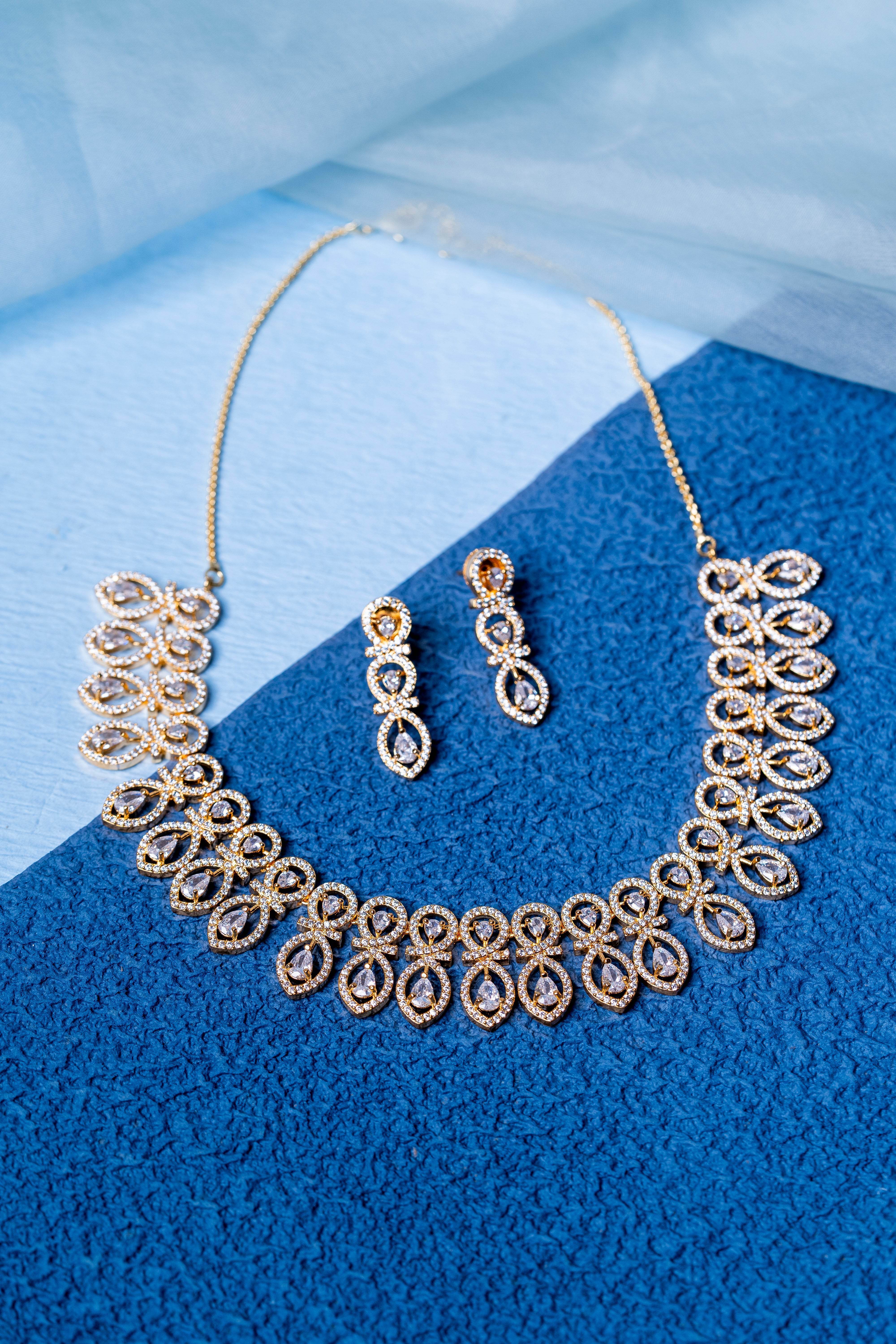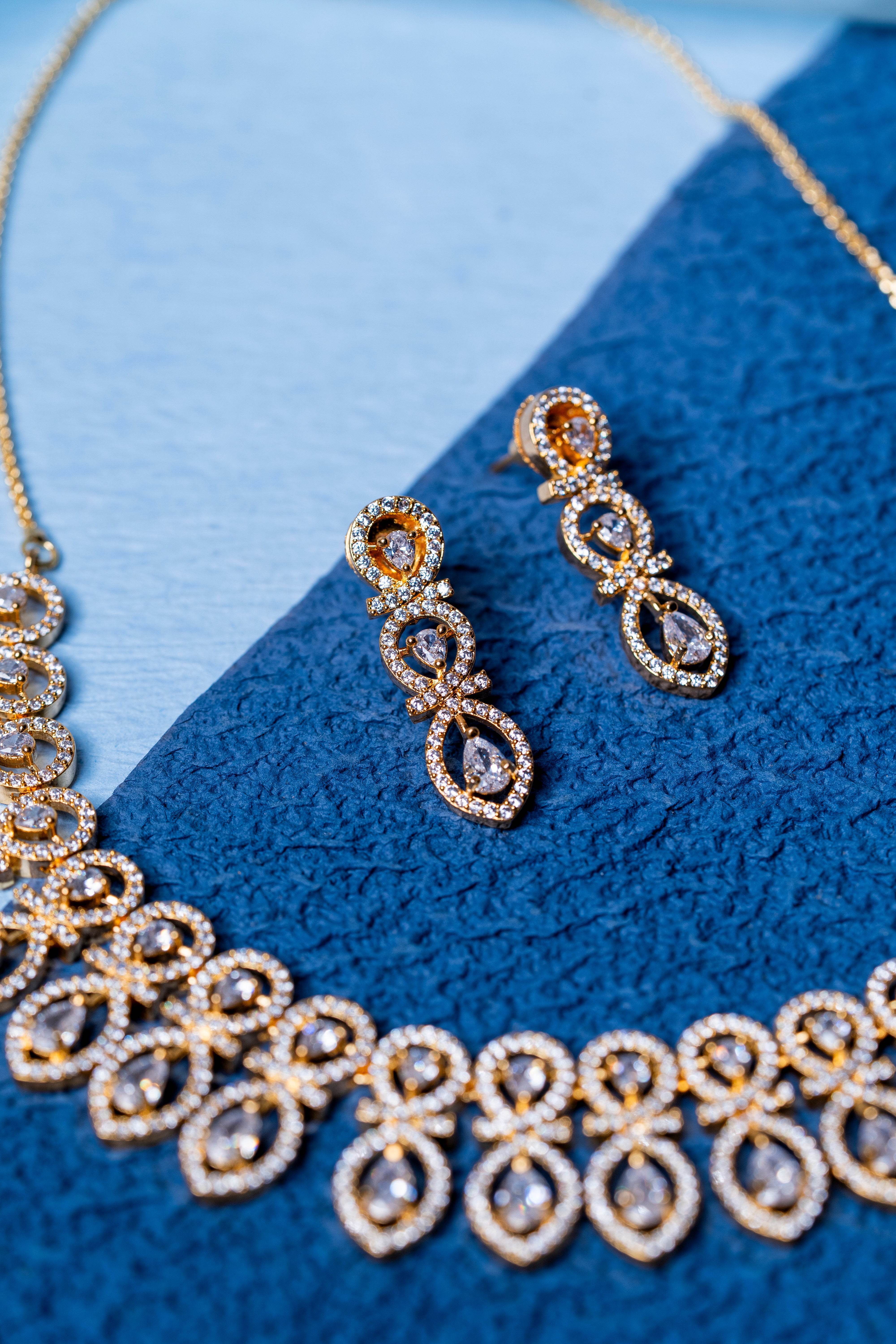 Celebrate in style with the Golden Bliss Set. This necklace and earrings sparkle with golden loops and shining stones, creating a gentle, festive glow. Soft yet glamorous, it’s perfect for big occasions and helps every bride shine with confidence and joy.