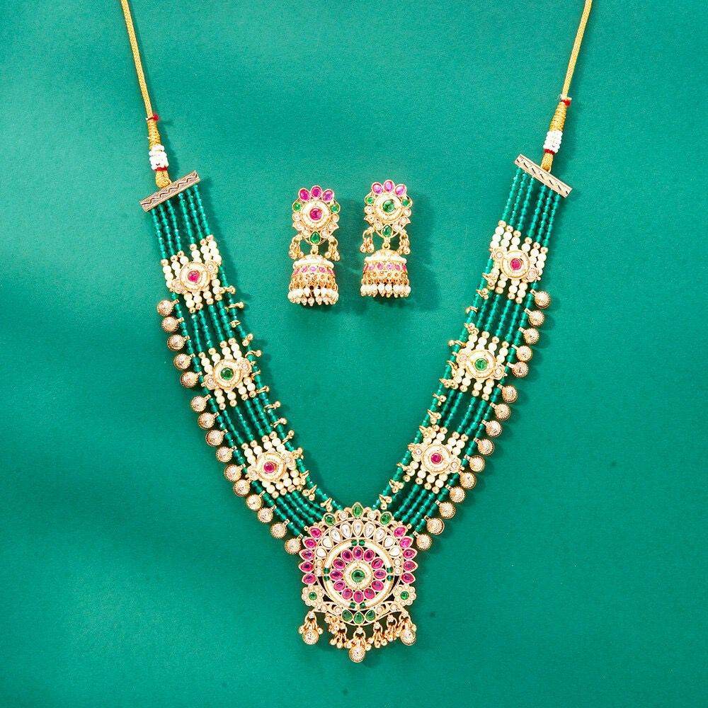Step into your wedding day with grace and grandeur. This majestic necklace set blends tradition and modern style with rows of lustrous green beads, golden temple-inspired detailing, and a statement-worthy pendant encrusted with pink, green, and white stones. The matching jhumka earrings, adorned with delicate pearls, are designed to sway with your every move—ensuring all eyes are on you. Perfect for the bride who loves bold elegance and timeless heritage, this set is more than jewelry; it’s your crowning glory for life's biggest celebration.