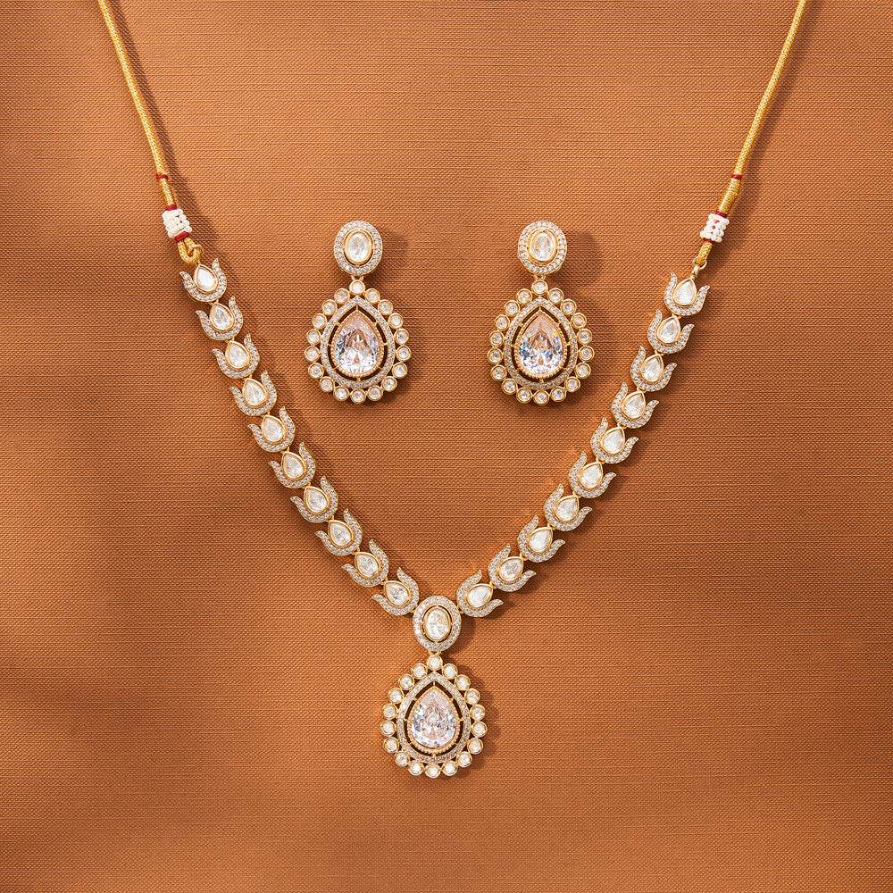 Radiate pure sophistication on your wedding day with this magnificent diamond-encrusted set. A stunning teardrop pendant, encircled by a halo of brilliant diamonds, is the centerpiece of a magnificent necklace crafted with a floral leaf motif. Paired with ornate, matching earrings, this set is a true statement piece that embodies timeless luxury and traditional artistry, ensuring you shine like royalty.